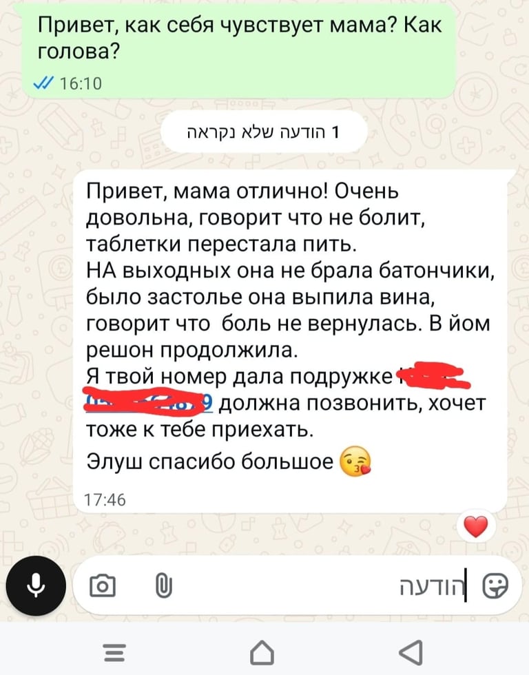 היי, אמא מצוין. מאוד מרוצה, אומרת שאין כאבי ראש והיא הפסיקה לקחת כדורים.